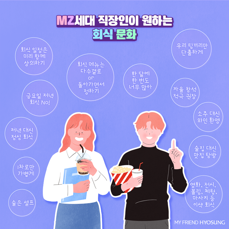 처음에는 어색하고 색다른 회식 문화를 못 받아들이는 분들도 계시겠지만, 사실 팀장님들도 어디로 회식 갈까 가 늘 고민입니다. 그 짐을 덜고 새로운 첫 발을 내딛고 나면 의외로 사람들은 다른 사람의 취향을 경험해 보는 걸 즐거워하고 그 사람에 대해서 더 잘 알게 되면서 예전보다 더 가깝게 여겨지기도 합니다.