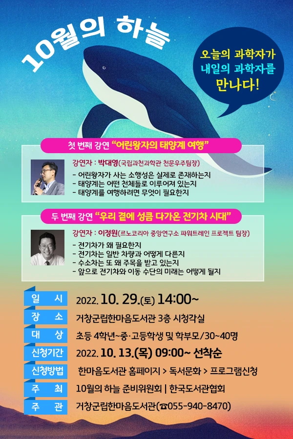 페이스북에서 훔쳐보던 정재승 교수님께서 9월 말에 글을 하나 올리셨다. "10월의 하늘"이라고 전국의 시골 도서관을 찾아가서 강의 기부하는 행사가 있는데 지원자가 부족하다고 많이 참여해 달라는 글이었다.