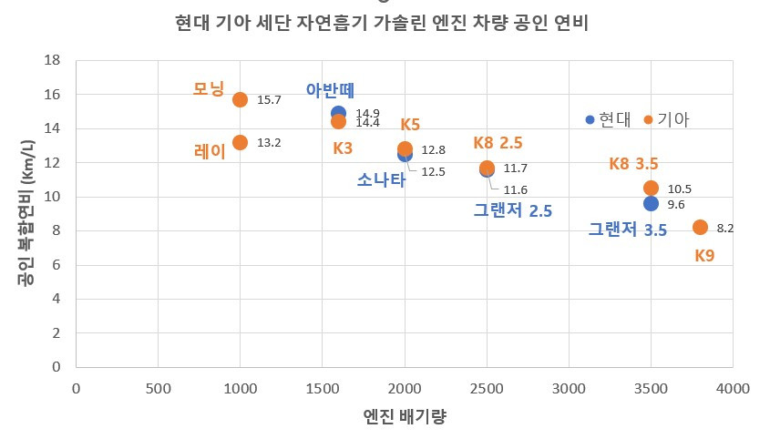 현대 자동차 홈페이지에 공시된 모델들을 기준으로 살펴보면, 배기량이 크면 클수록 연비가 나빠지는 경향을 볼 수 있다. 차량의 무게도 대형차로 가면서 더 무거워진 것도 있지만 일반적인 주행을 하는 데는 1.0L 엔진으로도 충분하다.