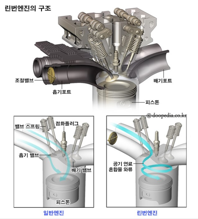 연료가 부족하면 제대로 점화가 안 될 수 있는 단점을 개선하기 위해 린번 엔진은 흡기 장치에 별도의 와류(Turbulance) 밸브를 설치해서 연료가 많이 섞여 있는 쪽 공기가 점화 플러그 주변에 많이 모여 있을 수 있도록 연료 혼합기의 흐름을 제어했다. 그렇게 한번 폭발이 일어나고 나면, 점화 플러그 바깥쪽에 있는 남은 희박한 연료들도 충분히 태울 수 있다.