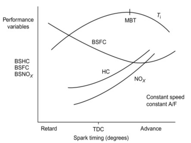 그렇다고 너무 늦게 지연하면 출력 자체가 떨어지는 현상도 나타난다. 이렇듯 각 엔진 운전 영역에 따라서 최적의 출력을 내는 점화 시기 MBT (Maximum Brake Torque timing)가 존재한다. 자동차 개발 시에는 영역 별로, 냉각수 온도, 외기 온도, 고도에 따라서 점화시기를 조정해서 어떤 조건에서도 최적의 효율을 낼 수 있도록 설정한다.