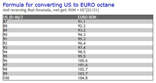 지역별로 차이는 있지만 최소 허용치가 한국과 유사하므로, 미국에서 온 차량들은 굳이 고급 휘발유를 넣을 필요는 없다. 유럽에 온 차량도 국내 판매를 위해서는 옥탄가 92인 표준 휘발유로 성능 인증을 받아야 한다.