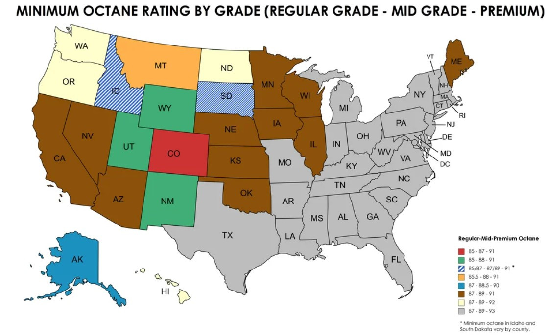 이에 비해 미국은 산출하는 방식도 조금 다르다. 실험에서 측정한 옥탄가인 RON (Research Octane Number) 값과 실제 엔진에서 측정한 MON (Motor Octacn Number) 값을 평균해서 노킹을 방지하는 기준이라는 뜻의 AKI (Anti Knocking Index)로 관리한다. MON 값이 RON보다 낮아서 미국의 주유소에 가면 옥탄가 숫자가 한국보다 보통 낮지만, 기본적으로 88 정도가 한국의 92 일반 휘발유와 동일하다.