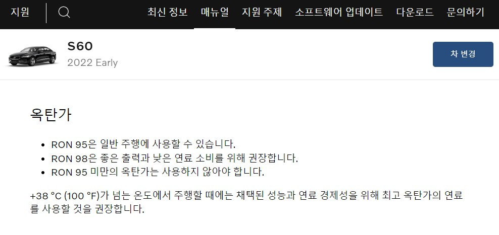 우리나라의 일반 휘발유 옥탄가의 기준은 92다. 국내에서 개발된 차량들은 모두 이 기준에 맞춰 개발되어 있지만 수입차는 메이커에 따라 다르다. 유럽 사양을 그대로 가져와서 판매하는 볼보의 경우를 보면 유저 매뉴얼에 RON 95를 기본으로 사용하고, RON 98을 사용하면 더 좋다고 안내하고 있다. 고급 휘발유를 필수로 넣어야 한다는 의미이다.