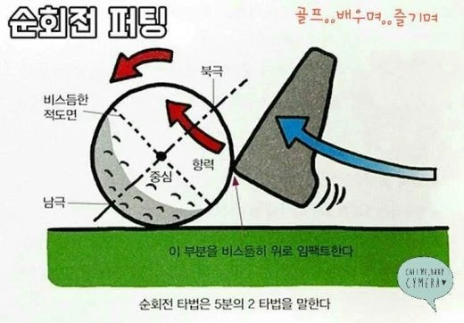 그리고 굴린다는 것 자체가 공의 회전 방향과 진행 방향이 동일하다는 걸 의미한다. 당구로 치면 밀어 치기와 같다. 당구공을 상 당점을 치듯이 퍼터를 적당한 높이로 들어서 진행 방향으로 굴리는 움직임이 더 생기도록 위로 살짝 들어 올리는 듯한 스크로크로 치면 잘 구른다. 이러면 좌우보다 위아래로 스트로크 방향이 되면서 직진성도 더 좋아질 것 같다.