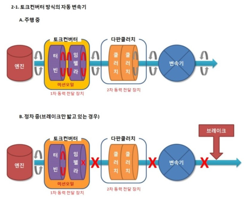 P단에서 시동을 걸고 난 후에 출발하기 위해 D단으로 변경하면, 차체가 부르르 떨리면서 RPM이 살짝 출렁이곤 한다. P단에서는 클러치를 통해 변속기와 전혀 연결되어 있지 않았던 엔진이 D를 놓는 순간, 동력 전달이 시작되고 앞으로 나가려는 여분의 에너지를 브레이크로 잡아 주는 상황에서 두 힘의 충돌이 차체의 진동을 만드는 것이다. P단에 있을 때와 비교하면 D단으로 놓았을 때가 당연히 연료 소비가 더 크다.