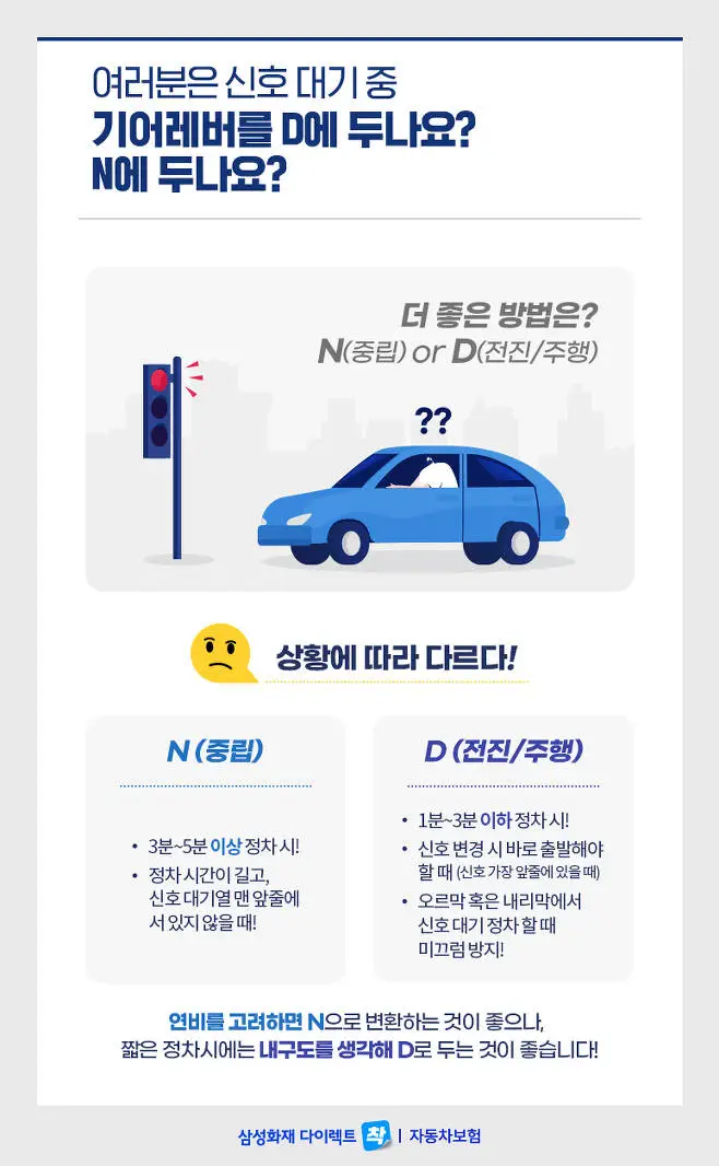 오히려 실 주행에서는 N단으로 뺐다가 다시 출발할 때 변속 레버를 조작하는 시간 딜레이가 있어 오히려 운전자가 더 급하게 액셀 조작을 하면서 전체 연비는 나빠지는 경우도 많다. 그래서 장시간 정차한다면 N-D 간에 유의미한 차이가 있겠지만, 3~4분 이내의 정차에서 N 단 설정은 연비에 영향이 없다. D단으로 유지하고 다음 출발을 부드럽게 시작하는 것이 오히려 더 유리하다. 그리고 5분 이상 정차 시에는 N 단 조작보다 시동을 끄는 것이 바람직하다.