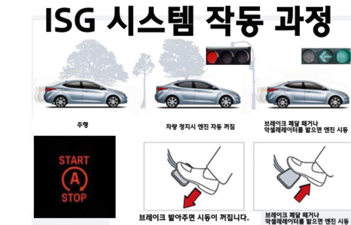 공인연비를 조금이라도 좋게 받기 위해 자동차 회사들은 정차 시에는 시동을 껐다가 다시 출발하면 재시동을 하는 IDLE STOP & GO ISG 시스템을 도입했다. 액셀과 브레이크 페달에 따라 운전자 의도를 파악해야 하고, 혹시 모를 안전사고를 막기 위한 복잡한 로직을 개발해야 하지만 연비에는 2% 정도 효과가 있다. 고속도로 주행보다는 가다 서다를 반복하는 일반도로에서 효과가 더 크다.