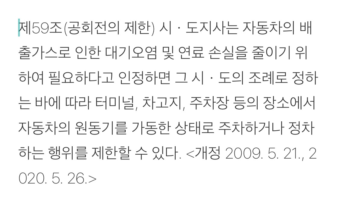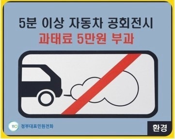 환경적인 측면에서도 좋지 않기 때문에 정부에는 대기환경법 59조로 공공장소에서의 공회전을 제한하고 있다. 지자체에서는 주정차가 잦은 지역에 대해서 5분 이상 정차하면 과태료를 부과하는 등 적극적인 조치를 취하고 있다.