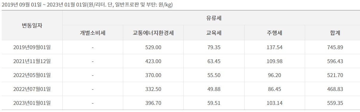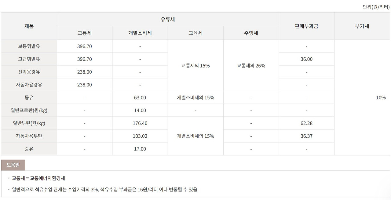 우리나라의 기름값은 정유사가 원유 혹은 국제 휘발유나 경유 가격(46%)에 3% 관세가 더해지고 이후 석유수입 부과금(16원/리터), 정유사와 주유소의 유통 비용과 마진을 제외하면 나머지는 다 세금이다. 교통에너지환경세, 교육세, 주행세는 2023년 1월 기준으로 휘발유가 559원, 경유가 336원에 최종 가격의 10%가 부가세로 붙는다. 1570원 휘발유의 45.6%, 1650원 경유의 30.4%가 세금으로 징수된다.
