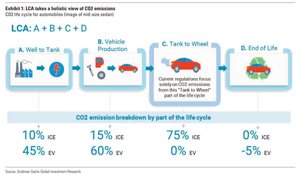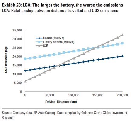 실제로 전기차를 생산하는 과정에서 발생되는 CO2의 양이 만만치 않다. 골드만삭스의 2019년 보고서에 따르면 배터리 전기차 생산 시 CO2 배출량은 가솔린 차의 2 배라고 한다. 주요한 원인은 배터리인데, 희토류를 중심으로 한 전극 재료의 생산과 셀 제조/알루미늄 제련에 많은 에너지를 필요로 하기 때문이다.