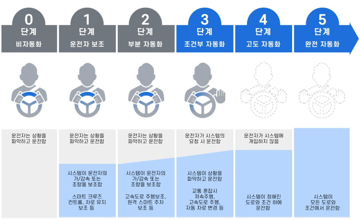 일단 0단계는 운전자가 모든 운전 조작을 수행하는 수동 운전 차량이다. 0 단계의 차량은 운전 보조 기술을 갖추고 있지 않고, 운전자의 조작이 전적으로 필요하다. 1단계는 안전을 위해 운전자를 보조하는 기술이 장착된 차량으로 주행 차선 유지, 가속 및 감속을 수행할 수 있지만 핸들링과 브레이킹을 동시에 제어할 수는 없고 운전자가 운전대를 반드시 잡고 조종해야 한다는 것을 전제로 한다.
