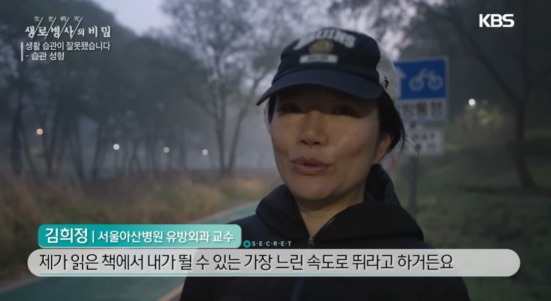 그러다가 우연히 본 "생로병사의 비밀"이라는 TV 프로에서 달리기로 출근하시는 교수님 이야기를 보게 되었다. 수술과 빡빡한 일정에 바쁜 사이에 김유정 교수님은 직장까지 10km를 매일 뛰어서 출근하셨다.