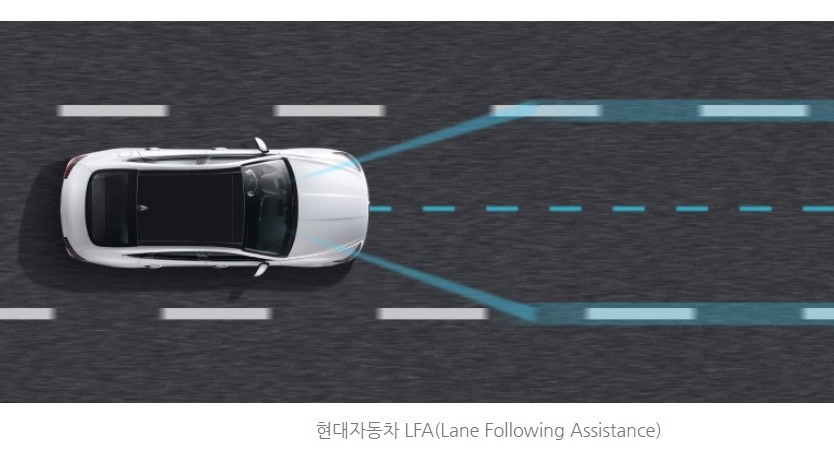자율 주행에 더 가까운 기능은 LFA(Lane Following Assist)라고 불이는 차로 유지 보조 기능이다. 차선을 넘어 가느냐에 중점이 맞추어져서 제어하는 LKA와는 달리 LFA는 최소한의 스티어링 조작으로 차가 차로 중앙을 유지하도록 도와준다. 차선이 없어지더라도 앞서 가는 차의 진로 방향을 추정해서 따라가도록 설정되어 있어 도로 조건에 관계없이 차선 유지를 할 수 있도록 한다.
