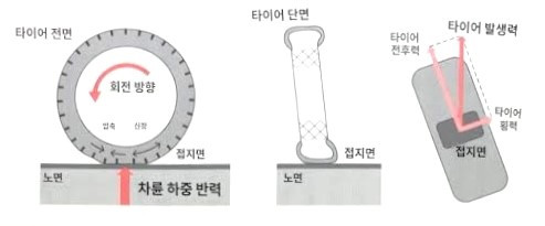 자동차는 4개의 타이어를 통해 노면에 접해 있다. 미끄러운 눈길에서는 액셀 페달을 밟아도 차가 앞으로 가지 않고 브레이크를 밟아도 멈추지 않는 경험들이 있을 것이다. 앞으로 가고 방향을 전환하고 멈추는 모든 동작들은 타이어와 노면 사이의 마찰력과 반발력 사이에서 이루어진다.