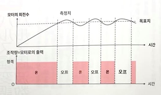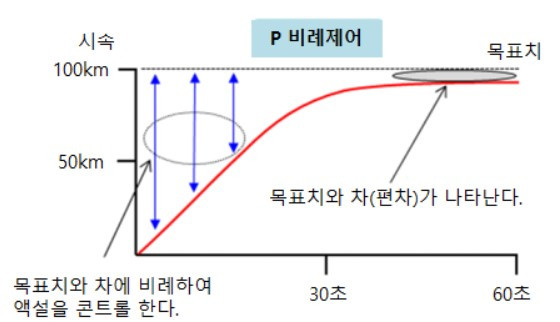 ON-OFF 제어는 기준치를 정하고 스위치를 조작하기만 하는 제어다 보니 단순하고 저렴하지만, 목표에 좀처럼 수렴하지 못하는 단점이 있다. 엔진이나 자동차 모두 관성이 있다 보니, 출력을 켜도 바로 속도가 올라가지도 않고, 출력을 끈다고 해도 바로 감속이 되지 않는다. 이래서는 속도가 울렁거리면서 승차감도 나쁠 수밖에 없다.