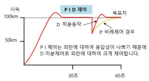 마지막으로 갑작스러운 변화에 대해서는 현재 값의 미분(d) 값을 모니터링하다가 반대 방향으로 카운트 출력을 대응하는 로직도 필요하다. 빠르게 목표치를 따라가고(P), 부드럽게 연착륙하고(I), 급격한 변화에도 빠르게 복귀하는(D) PID 제어는 이렇게 서로를 보완한다. 자동차에서 차속이나 RPM, 온도 같이 일정한 목표치를 따라가야 하는 대부분의 로직에 널리 사용되고 있다.