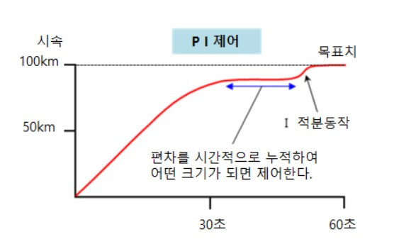 다만 오차에 비례하도록 출력 값을 정하면 목표 주변에서는 변화폭이 급격히 줄어들게 된다. 목표에 도달하지 못하고 Saturation 되는 기간이 늘어나면 그 기간을 적분(I)해서 출력값을 보정해 주는 PI제어가 작동해서 목표에 부드러운 연착륙을 가능하게 해 준다.