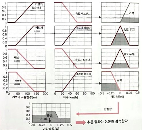 자동차가 커브길에 접어들었을 때 어느 정도 속도를 낮추어야 하는지도 주관적 판단과 연관이 있다. 너무 빠르면 위험하다고 느껴질 것이고, 너무 느리면 답답할 것이다. 스티어링 휠을 많이 돌려야 하는 급 회전 구간에서는 안전을 위해 속도를 많이 줄여야 하겠지만 회전 반경이 크다면 달리는 흐름을 이어가고 싶을 것이다. 이런 요소들에 대해서 적절하다고 판단되는 정도를 수치화한 후에 이를 모은 합집합의 중심을 찾으면 최적의 감속 목표를 찾아 그에 맞게 출력을 제한하거나 브레이킹을 작동시킬 수 있다.