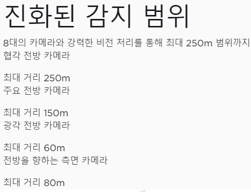대표적인 자율 주행 카메라 시스템은 테슬라 비전도 8개의 카메라에서 매 프레임마다 128개의 영상 조합을 만들어 주변을 살핀다. 그리고 형상과 색, 움직임을 실시간으로 분석하면서 기존의 학습을 통해 형상을 구분하고 앞으로의 움직임과 주행이 미칠 영향을 예상한다. 박쥐 같은 레이더가 없는 사람도 두 눈만으로도 충분히 안전하게 운전을 할 수 있는 원리를 그대로 모사하고 있는 셈이다.