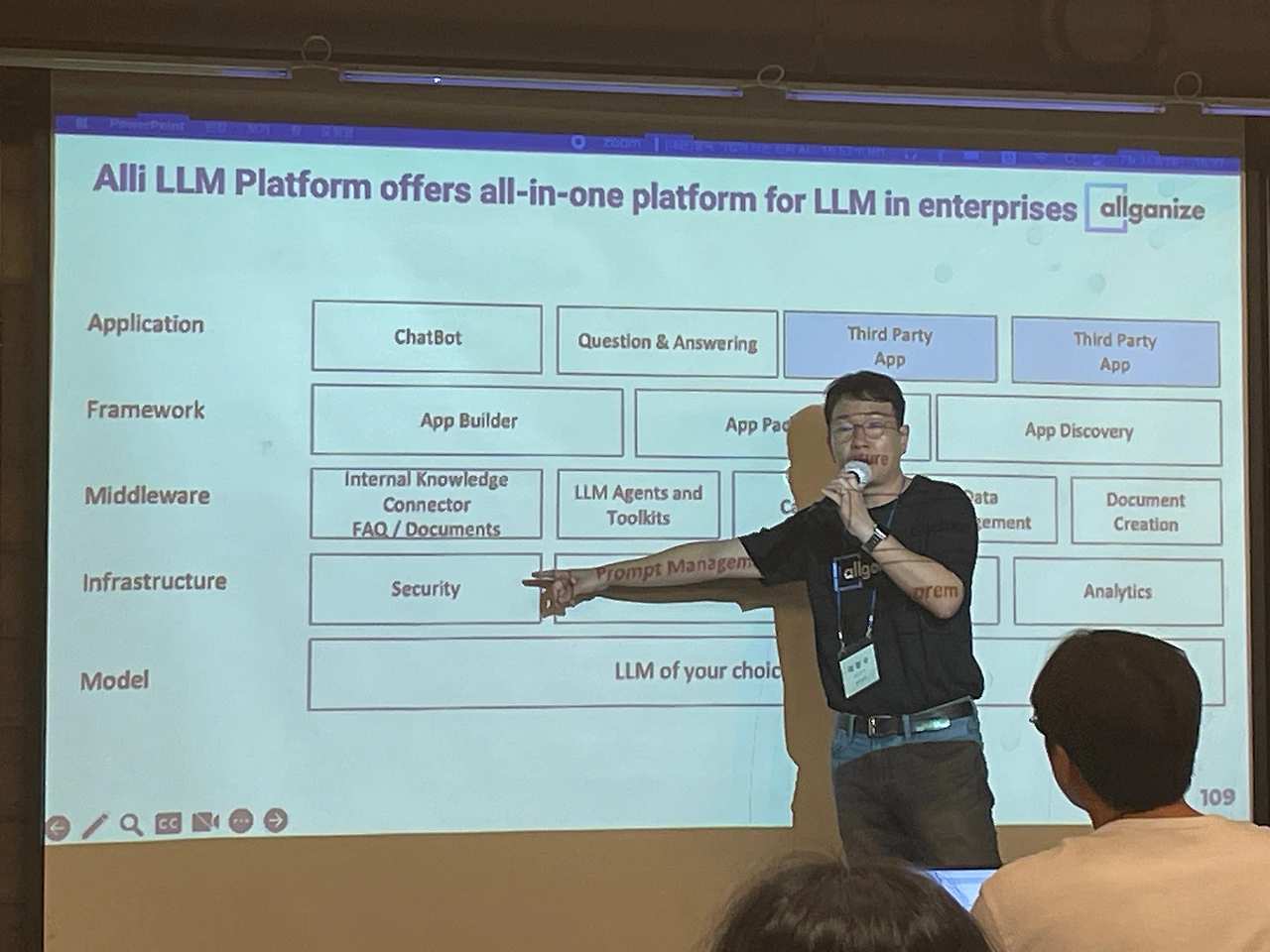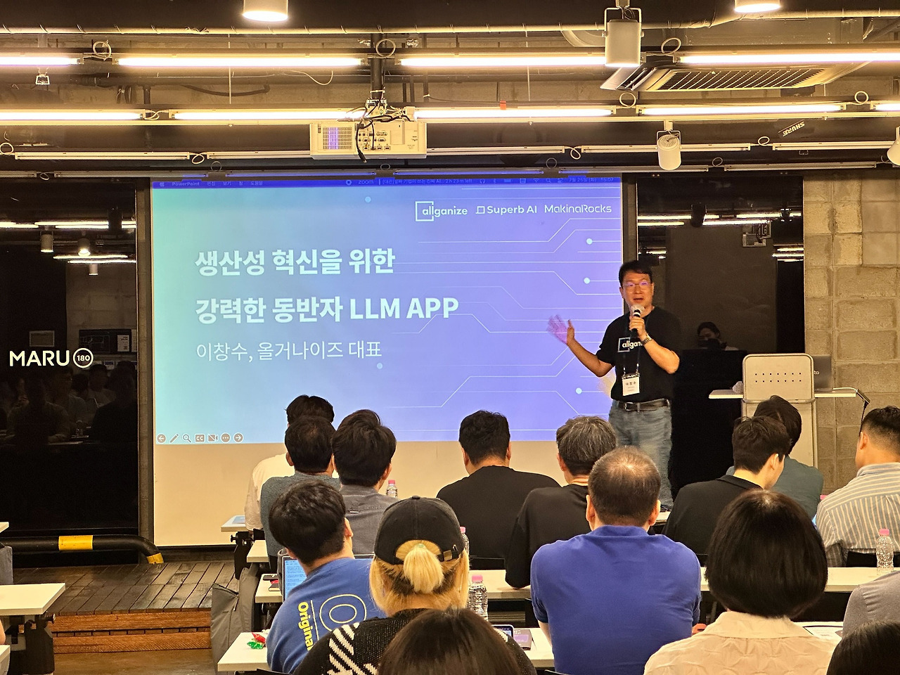 그러던 중에 미국에서 AI 기반으로 ALLGANIZER를 이끌고 있는 고등학교 후배 이창수 대표가 한국에 오고 세미나를 한다는 소식을 페북으로 접했다. 기업 내 문서 데이터 학습한 후에 chat gpt처럼 대화형으로 답해주는 서비스로 미국 일본 한국에서 다양한 B2B 사업을 하고 있는 후배 얼굴도 볼 겸, AI로 어떤 사업들이 시장에서 이루어지고 있는지도 궁금해서 참가 신청을 하고 오늘 다녀왔다.