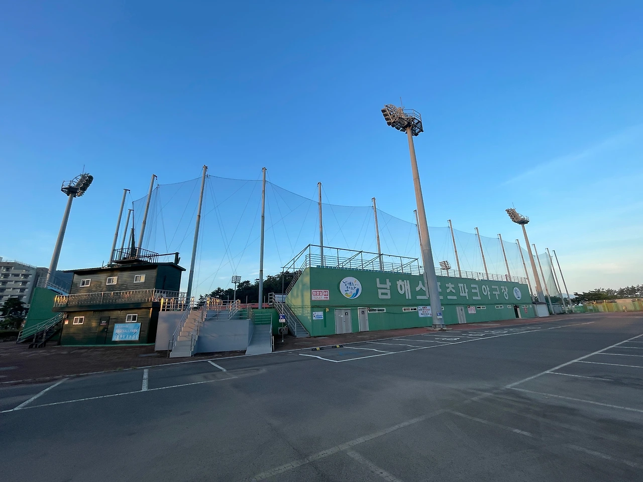 이곳에는 야구장도 있다. 남해스포츠파크 야구장. 텅 빈 더그아웃이었지만 오랜만에 그라운드에 서니 마음이 설렜다. 타격한 거처럼 1루로 전력 질주도 해보고, 2루 도루도 하고 3루 터치하고 홈까지 내달려 봤다. 새벽이어도 벌써 덥다.