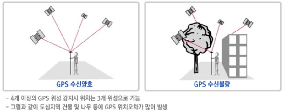 GPS를 이용한 거리 측정의 정밀도는 10미터 내외다. 위성으로부터 송신된 전파가 대기층을 통화하면서 왜곡되기도 하고, 높은 건물이나 산에 반사된 신호가 수신되기도 한다. 실내나 지형에 따라서 수신되는 위성의 수가 제한되면 위치 결정에 대한 정확도도 반감된다.
