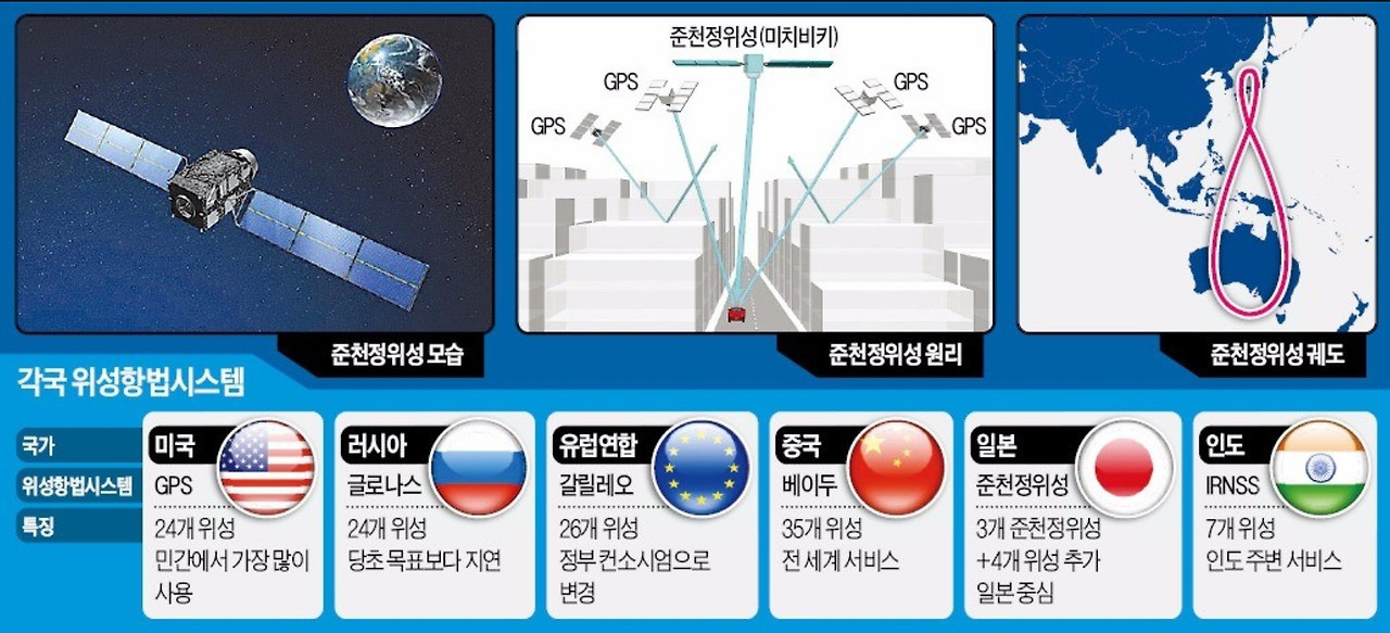 대표적인 예가 일본이 운영하고 있는 QZSS이다. 일본은 총 7개의 위성을 32000 km이상의 준청정궤도에 쏘아 올려 24시간 일본과 우리나라 상공에 신호를 송신하는 시스템을 구축하였다. 궤도는 일본을 중심으로 남태평양과 호주 주변을 8 자 형태로 도는데 우리나라에서도 활용할 수 있는 궤적이다.