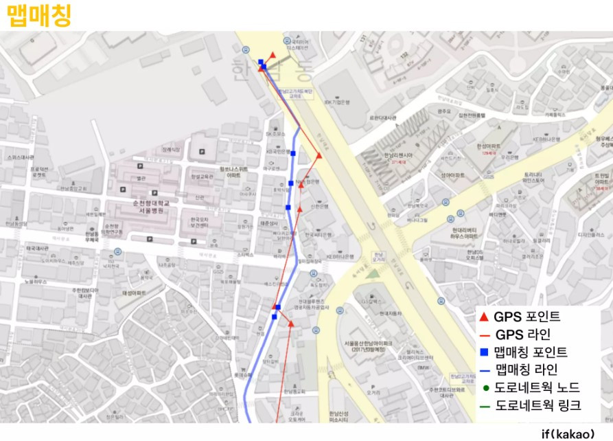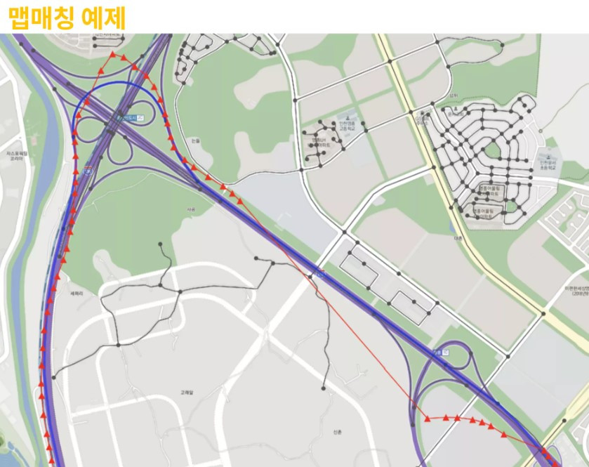 내 위치를 정확히 인지하는 것도 중요하지만 어쨌든 자동차는 길 위를 주행한다. 그래서 단순환 좌표 위치보다 내가 지도상의 어느 경로 위에 있고 어느 지점을 향해 가고 있는지를 파악하는 것이 가장 중요하다. 이렇듯 GPS를 통해 측정된 궤적을 기존의 지도 정보에 맞추는 작업을 맵 매칭(Map matching)이라고 부른다.