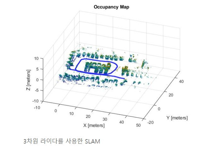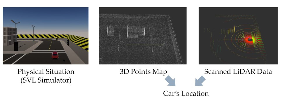 로봇처럼 제한된 공간이 아닌 공로를 주행하는 자율주행 자동차에서 SLAM은 부정확한 지도를 보완하고, 특히 진행 방향을 보정하는 역할을 한다. 카메라와 라이더 같은 센서들로부터 주변 상황에 대한 정보를 취합해서 가상의 3D Map을 구성하고 난 뒤에 이를 지도상의 정보와 맞추어 본다. 위치뿐 아니라 방향도 3D Point들을 맞추어 보면서 조정하게 된다.