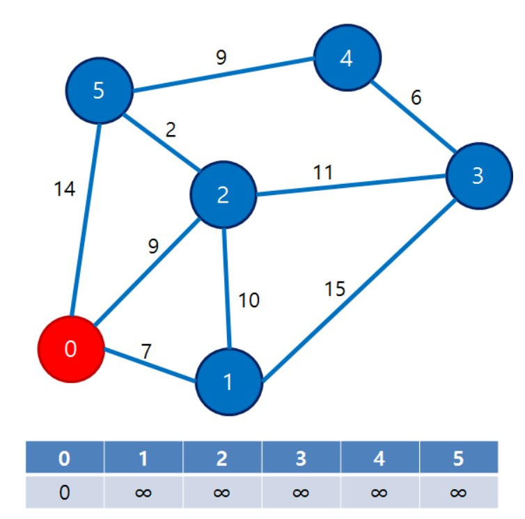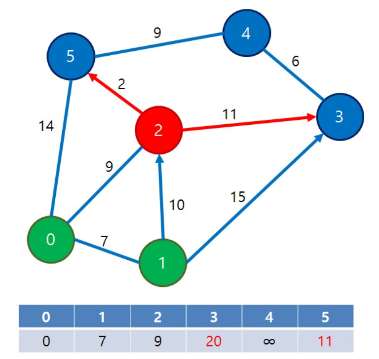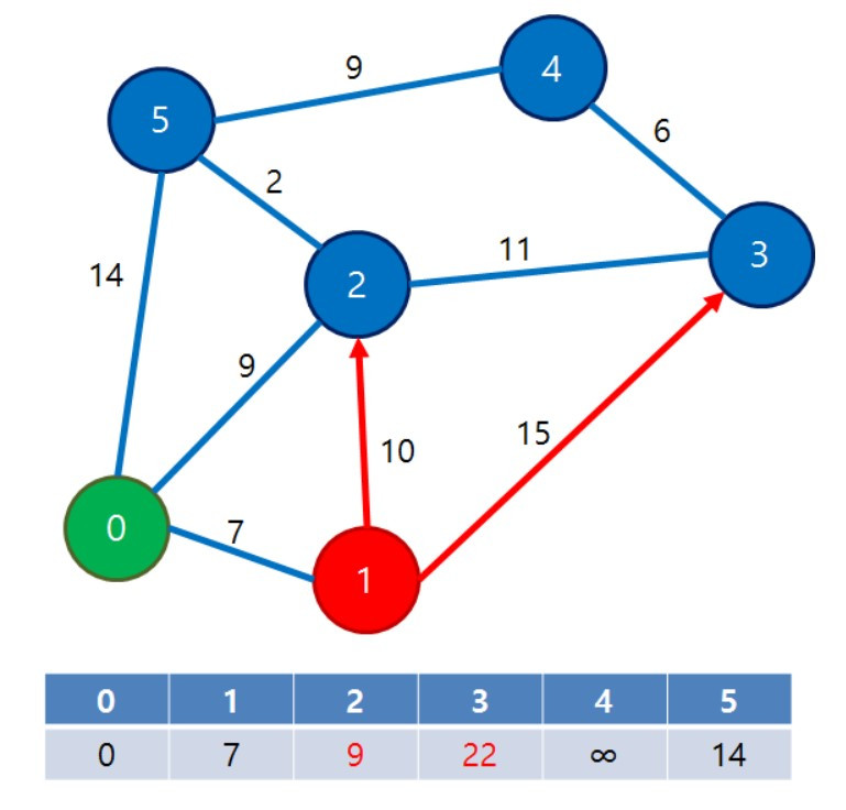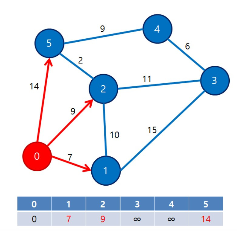 다익스트라법은 각 지점별로 출발점에 그 점까지 오는 최단거리를 순차적으로 하나씩 계산해 낸다. 제일 먼저 출발점 0에서 연결된 세 점에서 연결된 1/2/5번 노드까지의 거리를 비교해서 가장 짧은 노드 값을 확정한다(1번 노드-거리 7). 그리고 난 후에 앞서 확정한 0-1 조합을 새로운 출발 조합이라고 두고 거기에 연결된 새로운 연결들을 계산해 본다. 2번 노드의 경우 원래 거리가 9인데 1번을 거쳐 가는 거리는 10이므로, 그대로 9라는 값을 유지한다.