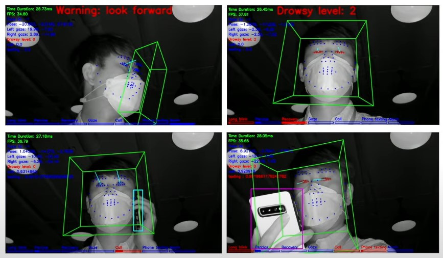 졸음운전도 위험한 요소 중에 하나이다. 마치 아이폰의 Face ID처럼 카메라를 통해 운전자의 얼굴을 인식하고, 안구의 움직임, 눈꺼풀의 위치, 시선 등을 분석해서 필요한 경고를 보낸다. 스마트폰을 보고 있는 것도 인식하고 전방을 주시하라고 메시지를 보낼 수 있다. 눈꺼풀이 자주 잠기고 조는 행동을 인식하면 휴식을 취하라고 하거나 안전 시스템에서 차로 전화를 걸어 잠을 깨우는 서비스도 상용화되었다.