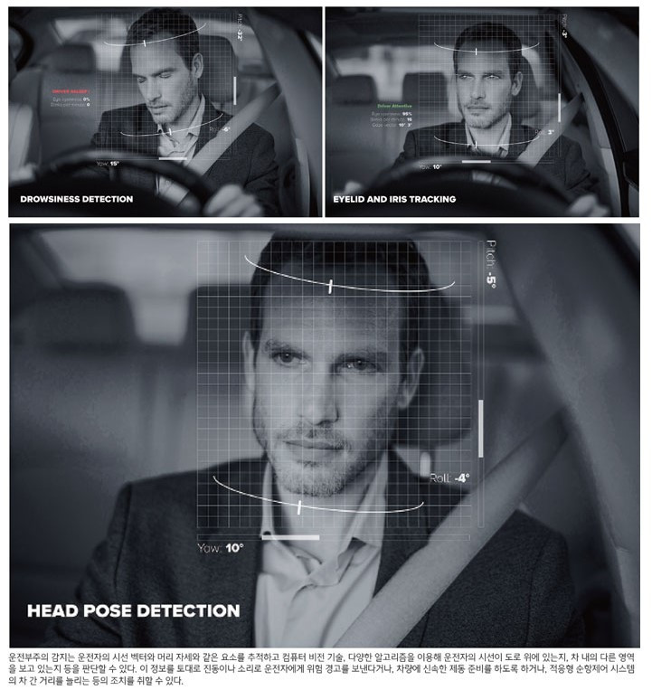 어디로 갈지 마음을 읽어서 차가 알아서 움직여 주면 좋겠지만, 아직 마음을 알아주는 기술은 먼 미래의 일이다. 다만, 우리가 의도하지 않아도 무의식적으로 의도가 드러나는 행동들이 있는데 대표적인 예가 시선이다. 우회전을 하려면 자연스럽게 사이드 미러 쪽으로 눈이 가고, 후진을 할 때는 룸미러로 시선이 향한다. 핸들과 액셀, 브레이크 페달을 통해 의도를 전달받았던 자동차가 자율주행이 되면서 자동차가 참고할 운전자에 대한 정보로 시선이 주목받고 있다.