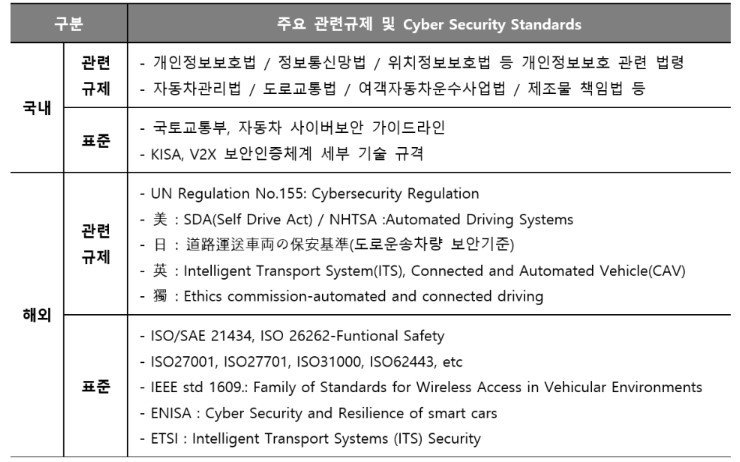 이런 상황을 막기 위해 유럽을 중심으로 사이버 보안 기능을 정의하고 의무화하는 규제들이 생겨나고 있다. 유엔 유럽 경제 위원회에서 제정한 자동차 사이버 보안 국제 기준에 따르면 2022년 이후 개발에 들어가는 모든 자동차는 기준에 따라 사이버보안 관리체계 (CSMS, Cyber Security Management System) 인증을 받아야 판매가 가능하다. 자동차의 기능에 영향을 미칠 수 있는 유무선 통신 / 내부 네트워크 / 각종 제어 장치들과 센서들 뿐 아니라 클라우드 서버까지 사고의 잠재적인 원인이 되는 위협에 취약한 지점들을 확인해서 위험을 보완하기 위한 기준들이 명확히 정의되어 있다.