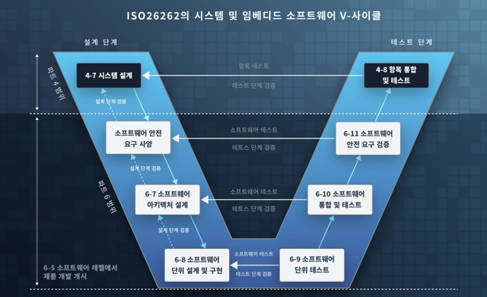 ASIL 등급을 받기 위해서는 지정되어 있는 기준을 만족함을 증명해야 한다. 에어백이 갑자기 터지는 심각한 고장은 발생을 막기 위해 작동 로직을 2중 3중으로 교차확인 시켜야 하고, 액셀 페달에 달린 센서는 고장이 날 경우를 대비해서 항상 두 개가 달려 있고 서로의 신호가 다르면 바로 림프홈이라는 안전 모드로 빠지도록 설계되어 있다. ASIL D 레벨로 가면, 단순히 고장 대응뿐 아니라 코딩의 안정성과 작동 관련 신호의 안정성에 대한 검증을 거치도록 되어 있다. ISO에는 이와 관련해서 설계 단계에서부터 검증하는 V-사이클을 정의해서 시스템을 설계하고 개발하는 과정 동안에 계속 검증하고 수정 보완하는 과정을 거치도록 한다.
