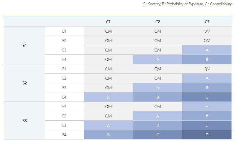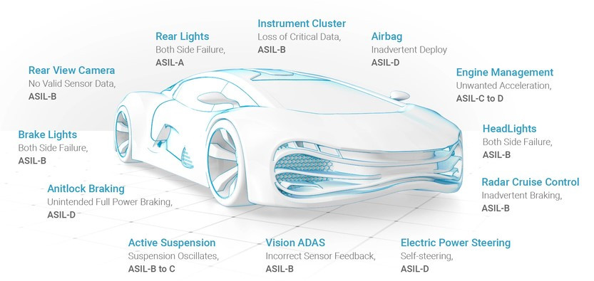 ISO26262 표준에 정의된 ASIL 레벨은 A에서 D까지 4등급으로 나뉜다. 위험도는 고장이 났을 때 사고가 얼마나 심각하게 날 수 있는지, 그리고 얼마나 자주 사용되는 장치인지, 마지막으로 고장이 났을 때 운전자가 충분히 대처할 수 있는지에 따라서 달라진다. 에어백이나 브레이크, 파워 스티어링과 같은 시스템은 가장 엄격한 ASIL-D 등급을 받아야 하고 크루즈 컨트롤은 ASIL-C, 헤드 라이트나 브레이크 라이트는 일반적으로 ASIL-B정도 수준이다.
