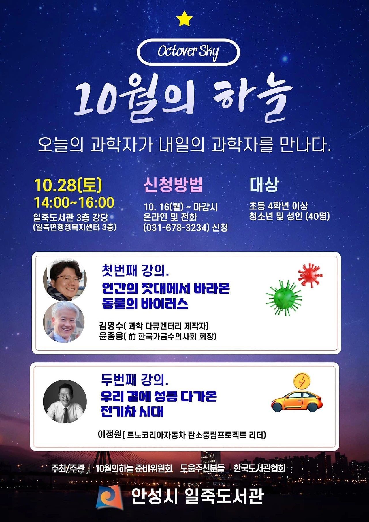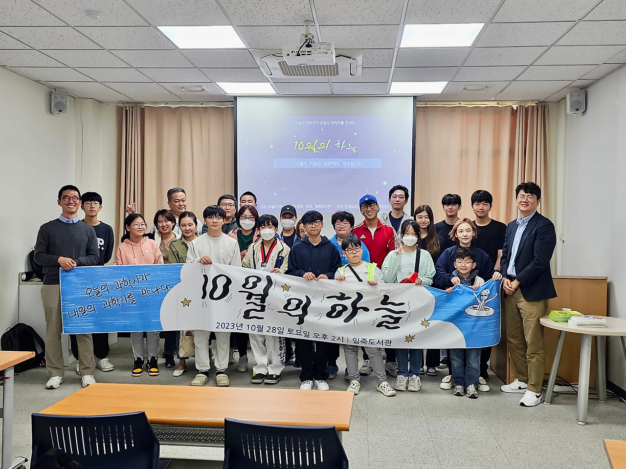 작년에 우연히 페이스북 친구로 이어진 카이스트 정재승 교수님의 공지를 보게 되었습니다. 10월의 하늘이라고 10월 마지막 주 토요일 오후에 전국의 50여 개 도서관에 과학 강연을 하는 기부 행사를 하는데 상대적으로 오지인 지역에 자원자가 없어서 지원자를 찾는다는 내용이었습니다.