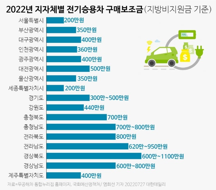 환경부는 전기차를 사는 사람들에게 국비로 지원해 준다. 거기에 지역마다 다르지만 각 지자체에서 추가하는 보조금을 포함하면 2022년에 800만 원에서 1900만 원에 달하는 지원을 받을 수 있었다. 무작정 돈을 주는 것이 아니라 전기차에 들어가는 배터리를 정부가 일정 지분을 사는 방식이어서 폐차할 때는 배터리를 다시 반납해야 하는 조건이지만 소비자 입장에서는 전기차를 구매할 때 한 번에 내야 하는 비싼 차 값 부담을 덜 수 있다.