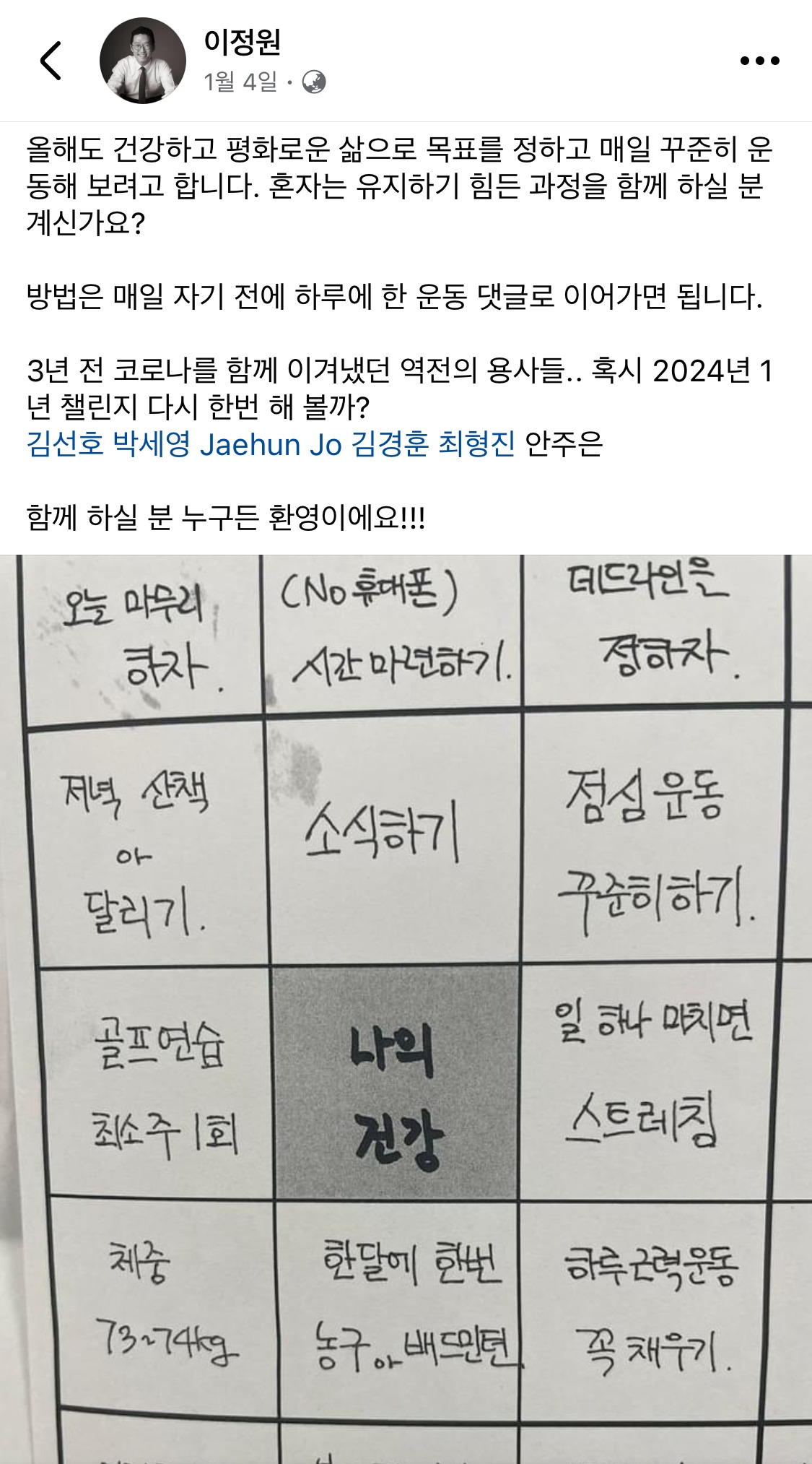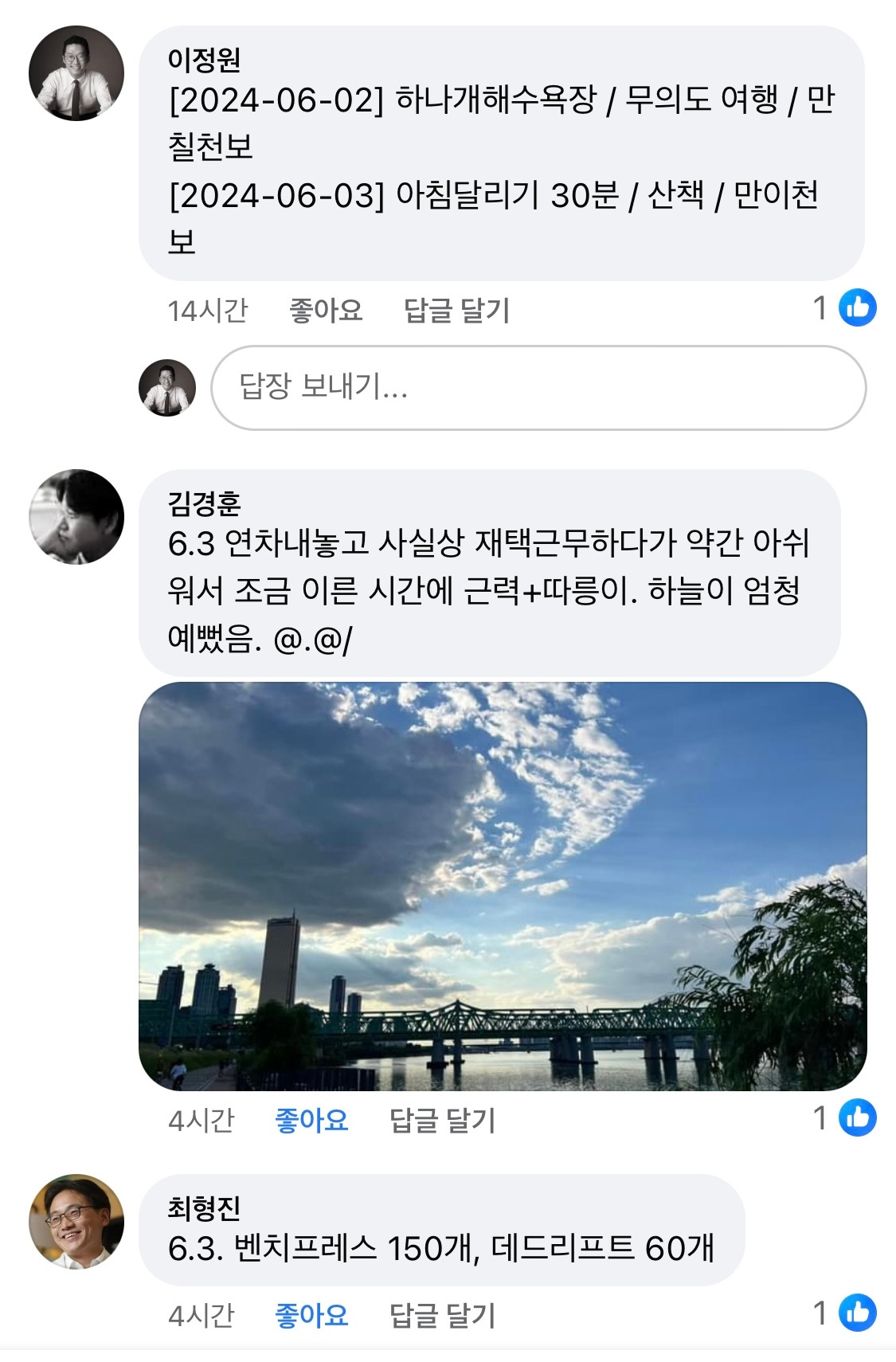그리고 매일 운동한 양을 서로 공유하면서 Cheer up 해 주는 친구들이 있습니다. 올초부터 페이스북에 함께 하자고 남겼더니, 멀리 창원에 있는 친구부터 선배님들까지 몇몇 분들이 매일 각자 한 운동을 댓글로 올리고 서로를 응원해 주는 모임이 만들어졌습니다. 참 고맙고도 귀한 인연들입니다.