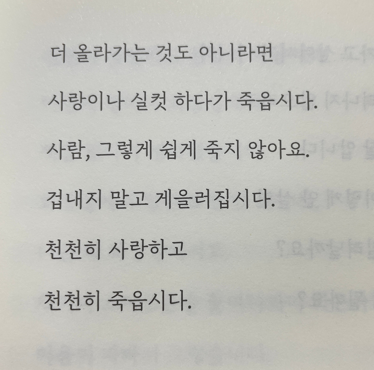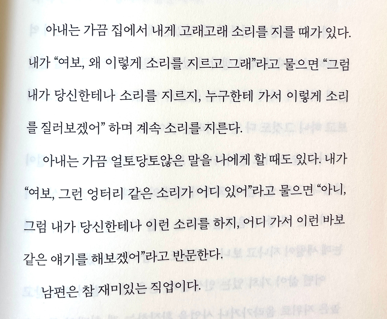 글을 통해 슬쩍 훔쳐보는 그들 부부의 삶은 우리와 참 많이 닮았다. 여행 가면 어디를 돌아다녀도 좋지만, 아무것도 하지 않고 책 보고 쉬는 걸 더 좋아한다. 선뜻 내린 어려운 결정들을 지지해 주고, 실수를 해도 추한 모습을 보여도 서로 받아 준다. 서로 피 한 방울 섞이지 않았고 같은 점보다 다른 점들이 많지만 서로 의지하면서 친구처럼 지내고 있다.