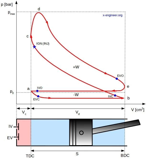연료를 태워서 화학 에너지를 운동에너지로 바꾸는 내연기관에서는 흡기 - 압축 - 폭발 - 배기라는 4가지 복잡한 과정을 거친다. 과정에 따라서 연소실 내의 부피와 압력이 변하는 과정에서 일을 한다. 연료와 점화 방식에 따라서 다른데 아무래도 디젤이 가솔린보다 효율이 더 좋아서 연료가 가진 열량을 100%라고 하면 가솔린 엔진이 25%, 디젤 엔진이 35% 정도다.