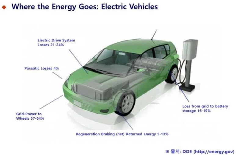 미국 에너지관리국에서 집계한 자료에 따르면, 전기 에너지 GRID에서 100%의 에너지가 있다면 충전하면서 18%가 손실되고 (--> 82%) 이중 모터로 전달되는데 전기 시스템 상에서 23% 정도가 더 낭비된다 (--> 59%). 모터에서 생성된 동력을 바퀴로 전달하는데 4% 정도 더 마찰력으로 손실되지만, 그중 8% 정도는 운행 중에 차속이 줄어들 때마다 바퀴가 돌아가는 힘으로 자체 충전을 해서 보충할 수 있어서 최종적으로는 대략 60% 정도의 전달 효율을 보인다고 조사되었다.