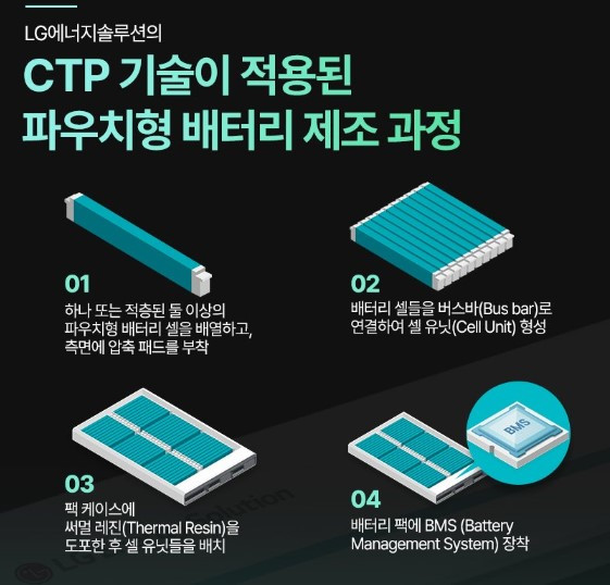 이런 경향을 반영해서 우리나라 업체들도 늦게나마 CTP 기술 개발에 참여하고 있다. 2024년 인터배터리 박람회에는 LG에너지솔루션과 SK ON 모두 NCM 파우치배터리로 CTP를 적용한 팩을 선보인 바 있다. 양산으로 적용하기에는 조금 더 시간이 필요하겠지만, 공간 효율을 높이고 가격을 낮추기 위해서는 우리도 바로 쫓아가야 하는 전기차 기술의 대세다.