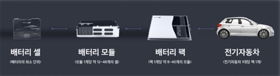 배터리의 기본을 이루는 셀은 전기에너지를 충전해서 사용할 수 있는 배터리의 기본 단위로 양극/음극/분리막/전해액을 알루미늄 케이스에 넣어 만든다. 이런 셀들을 관리하기 위한 모듈은 셀을 외부 충격과 열, 진동 등으로부터 보호하기 위해 프레임에 넣은 조립체를 말한다. BMS에서 배터리를 관리하는 기본 단위이기도 하다. 이런 모듈을 냉각 시스템 등 각종 제어 및 보호 시스템으로 구성해서 차에 올리기 위한 배터리의 최종 형태를 팩이라고 한다. 전기차에 탑재되는 배터리는 셀(Cell) / 모듈(Module) / 팩(Pack) 단위를 거쳐 완성된다.