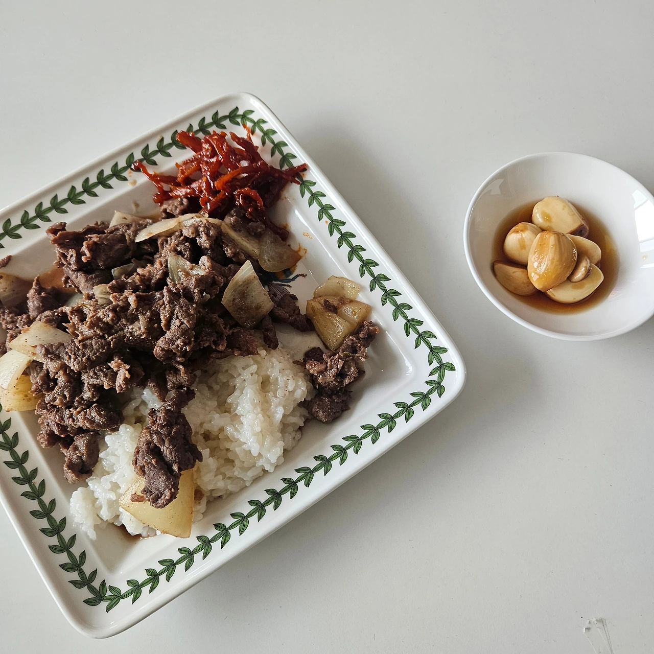 커다란 접시에 흰 밥을 얹고, 잘 익은 소불고기, 그리고 진미채볶음까지.