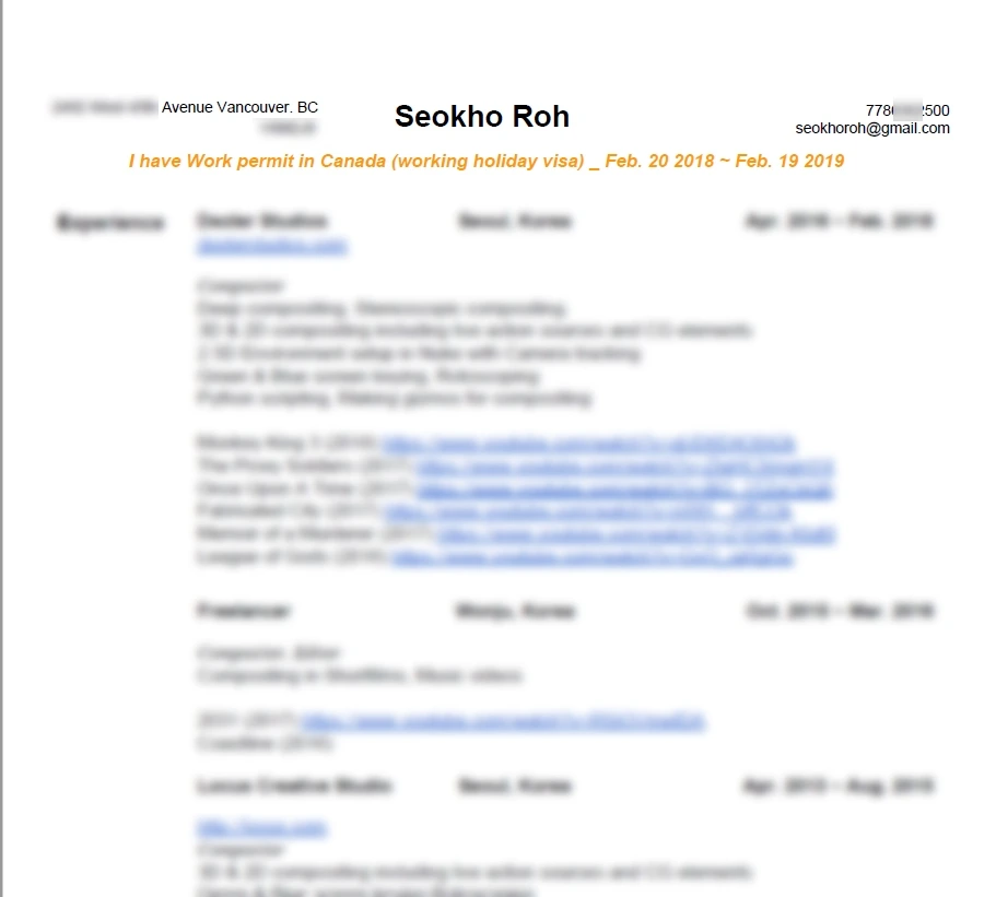 작지만 큰 변화 중에 하나는 레쥬메 안에 현재 거주하는 밴쿠버 주소지와 폰 넘버를 기입할 수 있다는 것이었습니다.