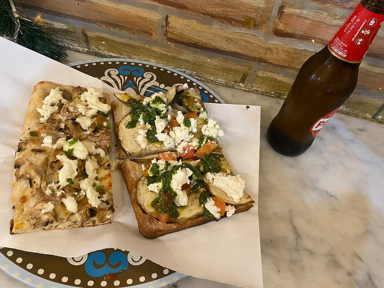 지아니콜로 언덕에 올라갔다가 내려와 들렀던 조각피자집. 구글 후기가 마음에 들어 방문한 곳인데, 입구에서 한참을 헤매다 들어가서 그런지 더 반가웠다. 고르는 데 한참 걸릴 정도로 먹음직스러운 피자가 너무 많았다. 영어에 능숙한 직원이 아니라 우리 둘 모두 다양한 방법의 소통을 시도했고, 덕분에 나의 기호에 꼭 맞는 피자를 골라 먹을 수 있었다. 조각의 사이즈도 고객이 직접 고르는데, 내가 원하는 사이즈를 손짓으로 알려주니 그가 고개를 갸웃거리더라. 그래 여긴 인당 피자 한 판을 가볍게 먹어치우는 곳이라고. 땀 흘리고 난 뒤 맥주 한 병과 함께 하는 피자라니... 세상 행복했다.
