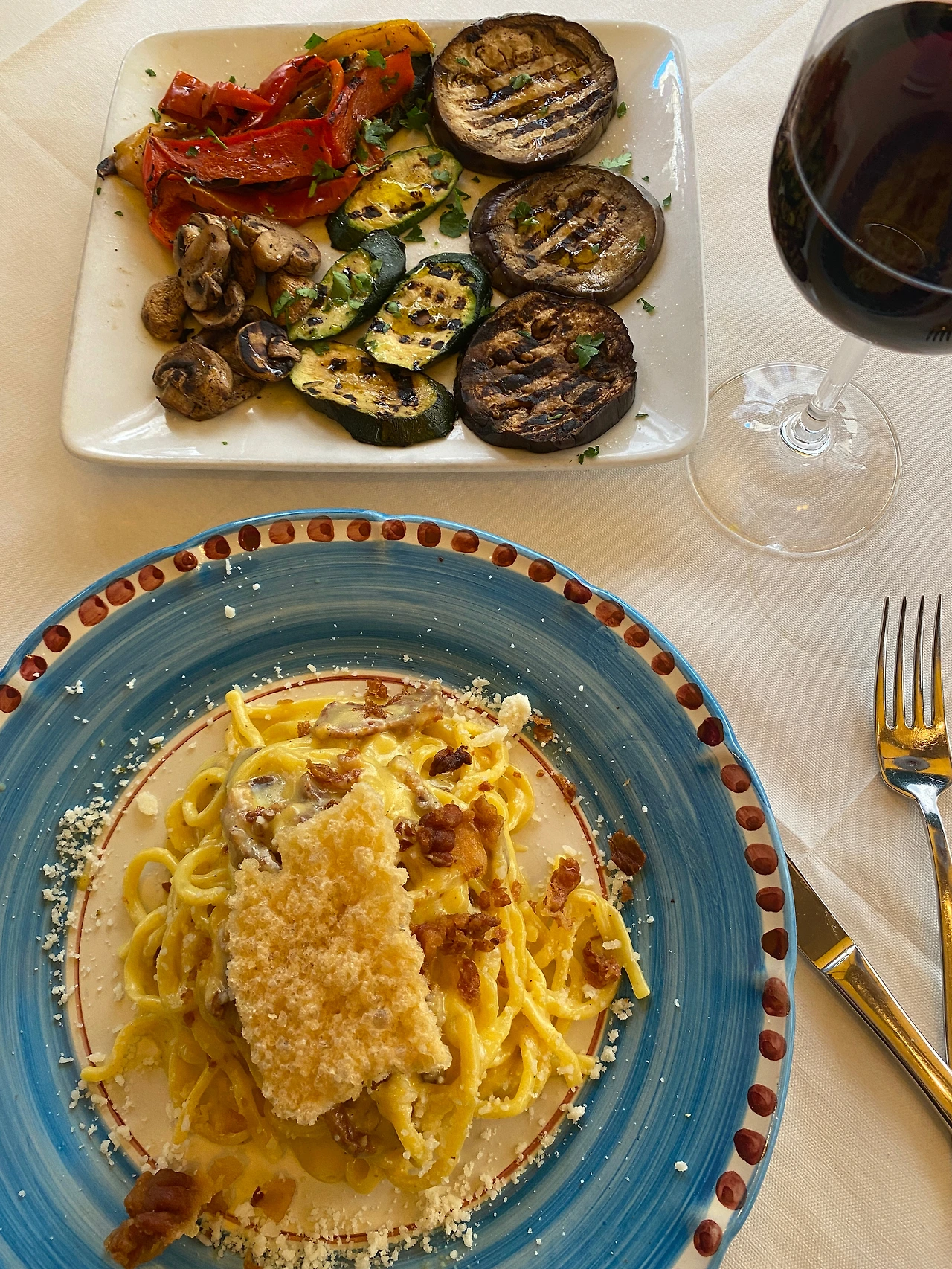 참고로 구운 야채를 주문한 건 신의 한수! 이탈리아 레스토랑에서는 생야채 샐러드를 만나기 어렵다. 난 야채 본연의 맛을 즐기고 싶은데, 대부분 올리브유에 흥건하게 젖어서 나오더라.(내가 주문을 잘 못했을지도...) 여기 구운 야채는 비교적 담백하게 조리되어 까르보나라의 짠맛을 조금 눌러 주었다.