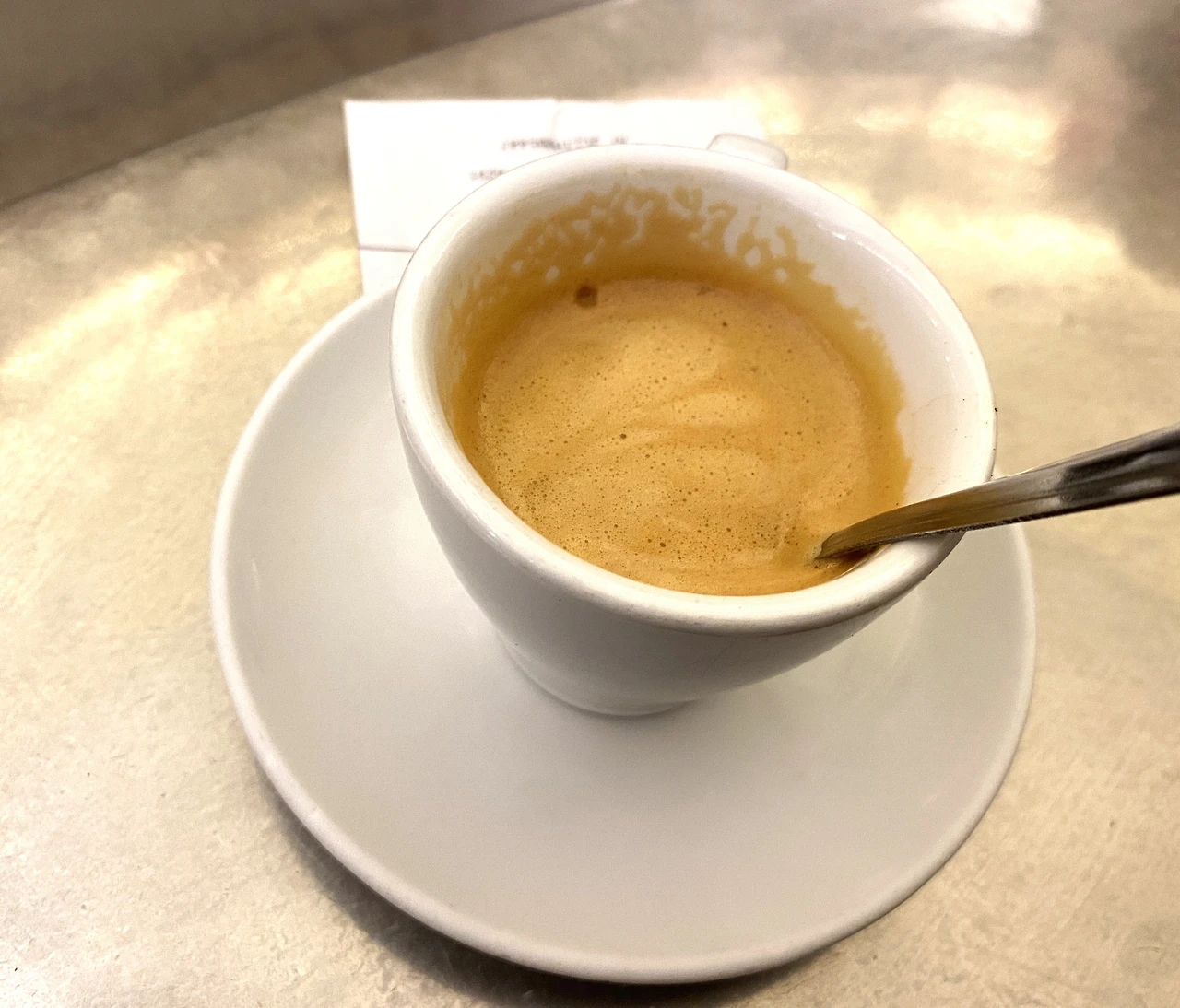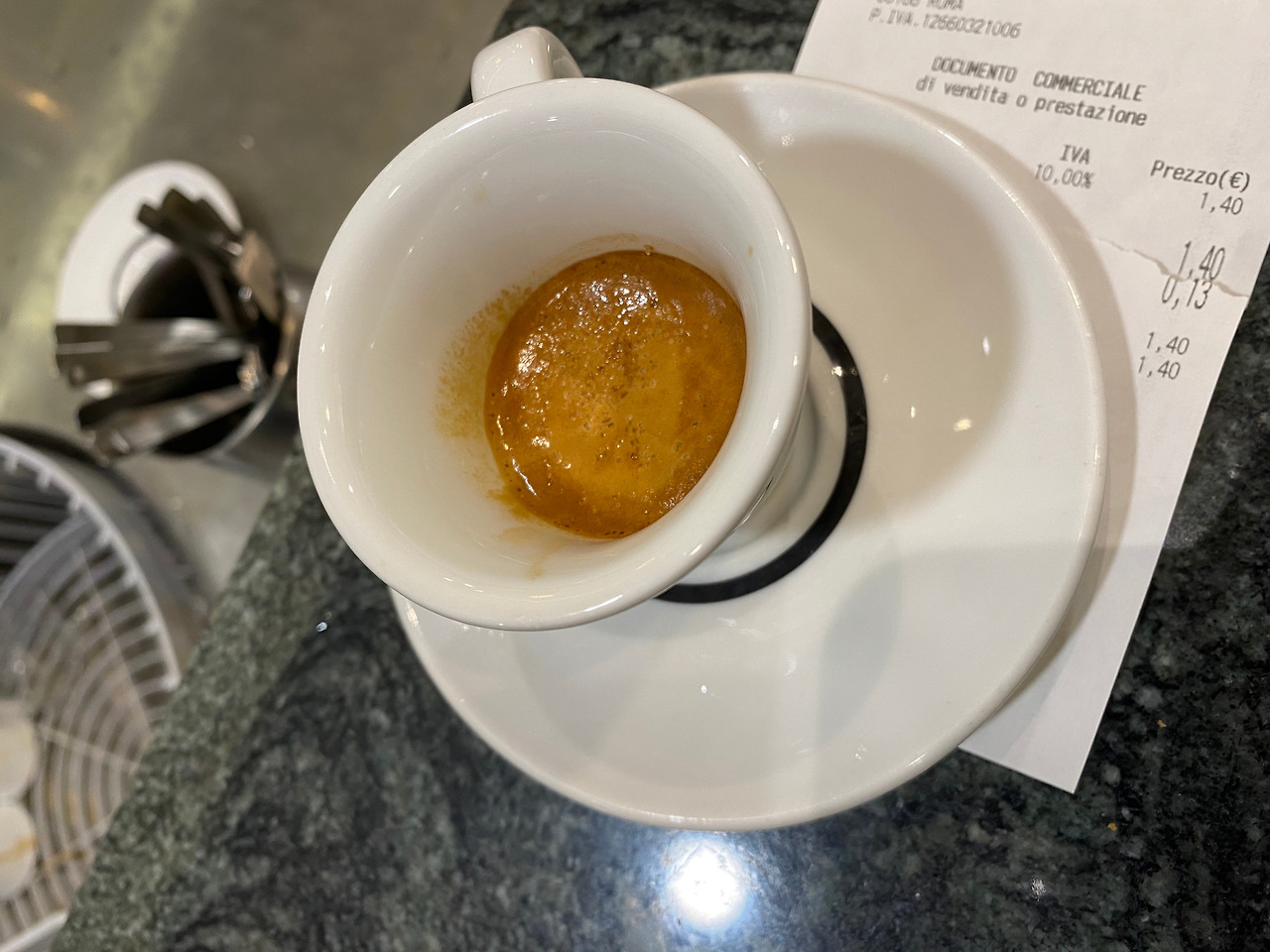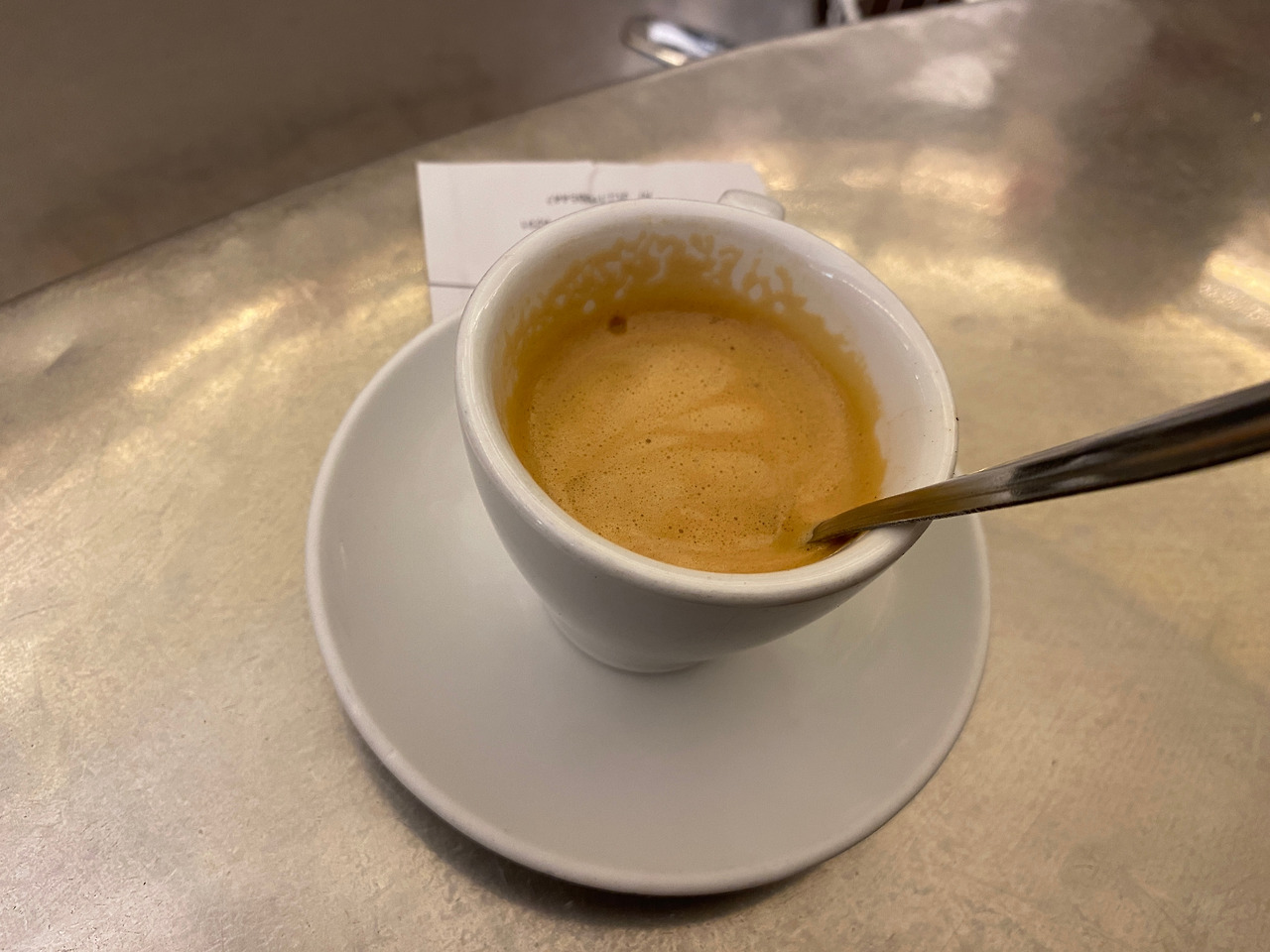 내가 처음 에스프레소를 마신 건 스페인에서였다. 다들 마시길래 엉겁결에 나도 따라 주문했는데, 타이어를 먹는다면 이런 맛일까 싶었다. 그 이후로는 용량 대비 비싸기만 한 이 메뉴를 주문하는 건 허세 같이 느껴지기도 했다. 이후 한국의 커피 수준도 정말 높아져서 맛있고 멋진 곳들이 여기저기 생기기 시작했고 에스프레소라는 메뉴도 널리 알려지기 시작했다. 동행들 덕분에 서울이나 부산, 강릉에서 에스프레소 바에 간 적이 몇 차례 있는데, 이런 맛이 사람들을 사로잡는구나 정도의 깨달음은 얻게 되었다. 그리고 올해 이탈리아에서는 어떤 생각이나 판단이 끼어들기 전에 에스프레소가 안겨주는 복합적인 풍미에 감탄하고 있는 자신을 발견했다. 진한데 텁텁하거나 쓰지 않고 부드럽고 쫀쫀하다. 그런데도 입가심이 될 정도로 깔끔한 뒷맛이라니... 좋다는 말이 절로 튀어나왔다. 중학교 때 자판기 믹스 커피를 시작으로 수십 년간 커피를 즐겨왔지만, 나는 이곳에서 처음으로 진짜 커피의 맛이 궁금해지기 시작했다.