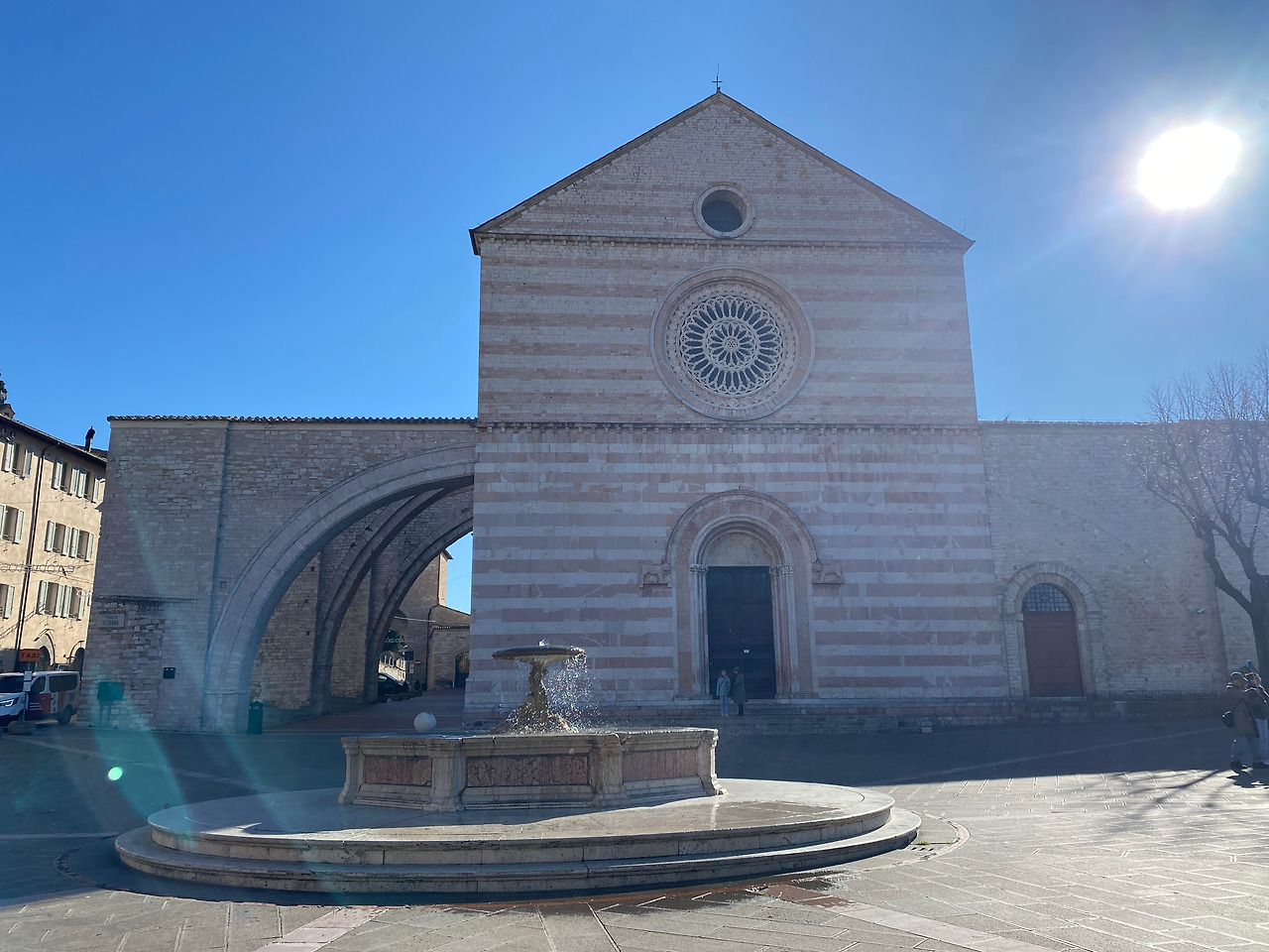 : 산 루피노 성당은 아시시의 두오모로 성 프란체스코와 성녀 키아라가 세례를 받은 곳으로 유명하고, 산타 키아라 성당은 성녀 키아라의 유해가 안치되어 있는 곳이다. 아시시의 성당은 외관이 다 비슷한 느낌을 주는데 창이 작고 외벽이 두꺼운 로마네스크 양식이 기초가 되어 그렇다고 한다. 산 루피노 성당은 장미 문양의 창이 세 개 있고, 산타 키아라 성당은 본건물을 지지하기 위해 튼튼한 부벽이 있다는 점이 특징적이다.